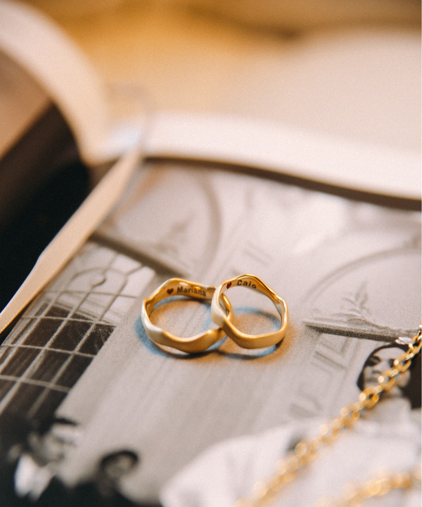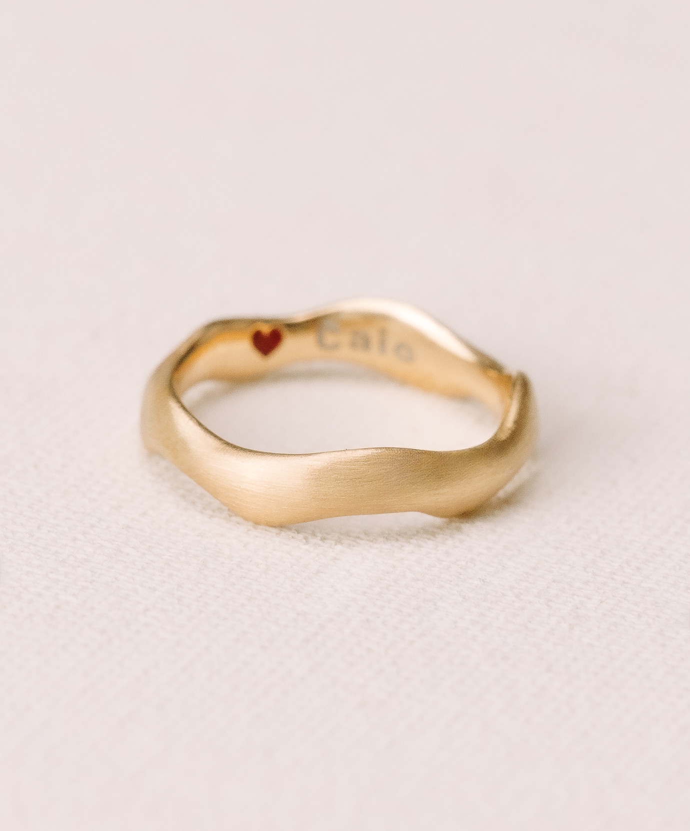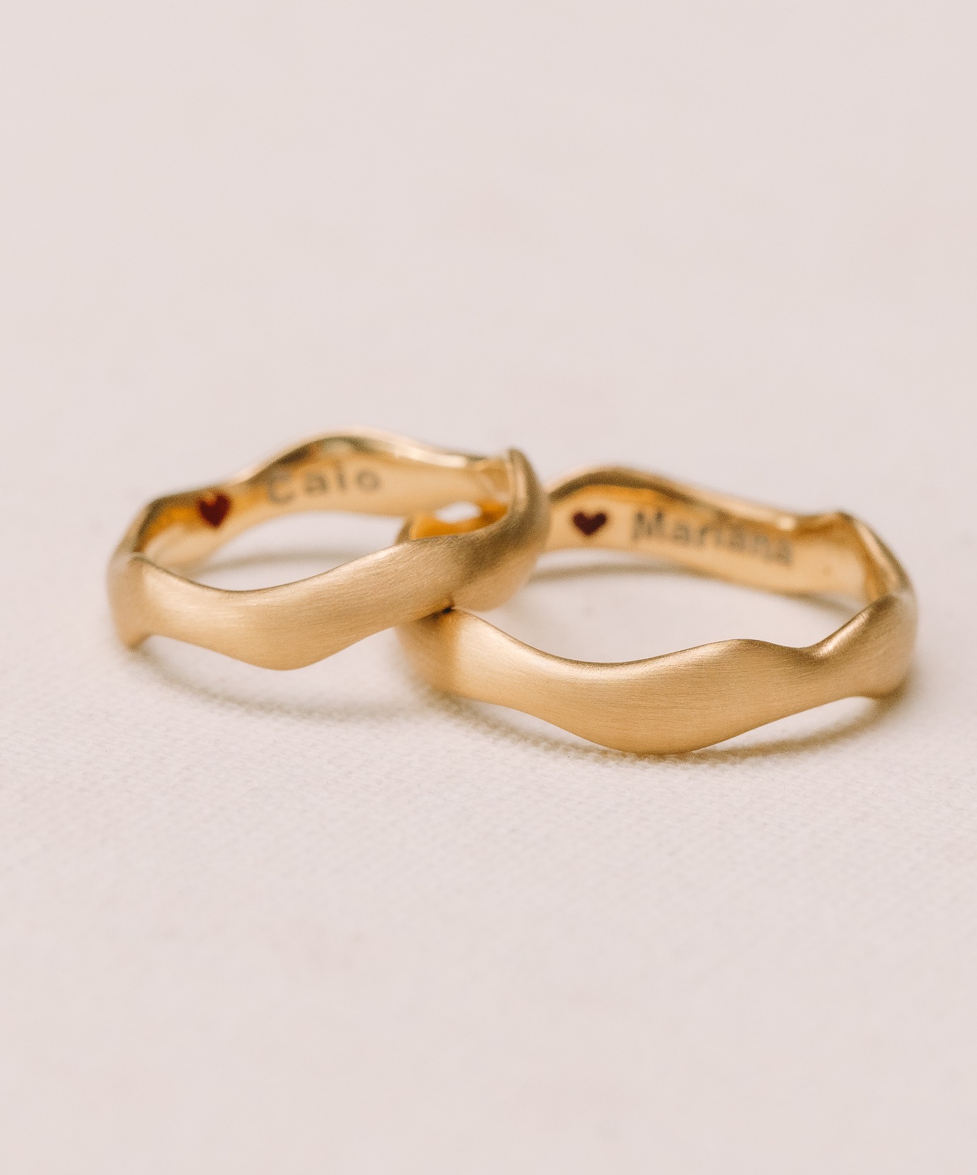 Esculpida em ouro 18k com acabamento fosco acetinado, a peça traz no interior o detalhe que a torna única: os nomes do casal e um coração esmaltado à mão, preservando para sempre a assinatura emocional de quem a veste. Cada pigmento aplicado carrega um gesto de afeto, transformando a aliança em um símbolo pessoal e eterno.