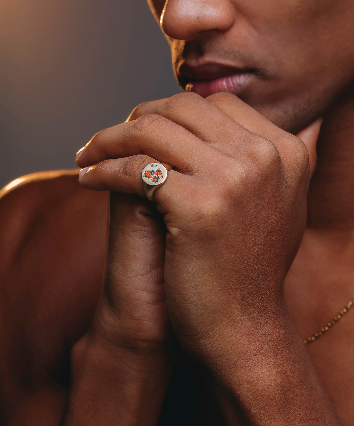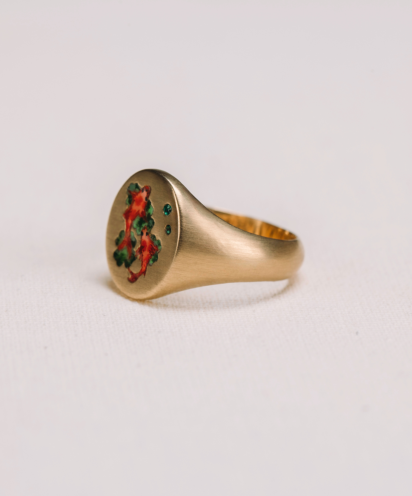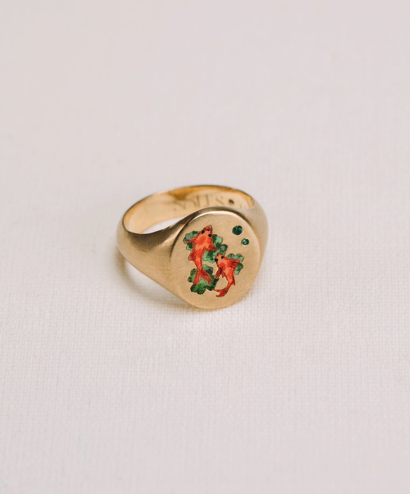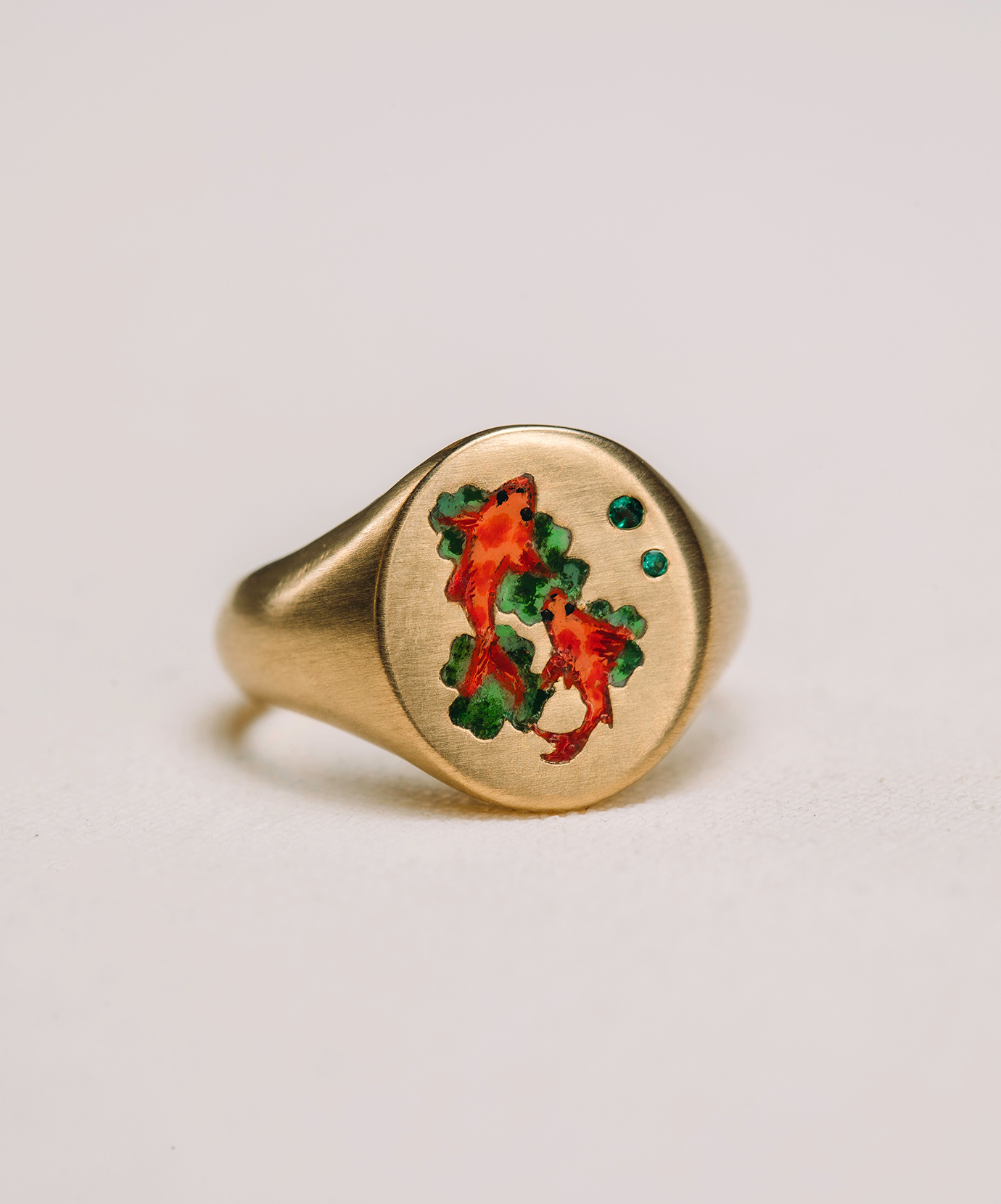 O Anel Carpa, produzido em ouro 18k, celebra resiliência, coragem e prosperidade. No centro da peça, a carpa é representada em uma micro pintura esmaltada feita à mão, revelando movimentos delicados e nuances que evocam superação e vitória sobre os desafios da vida. Cada detalhe é aplicado por uma única artesã, o que torna cada anel único em expressão e energia.