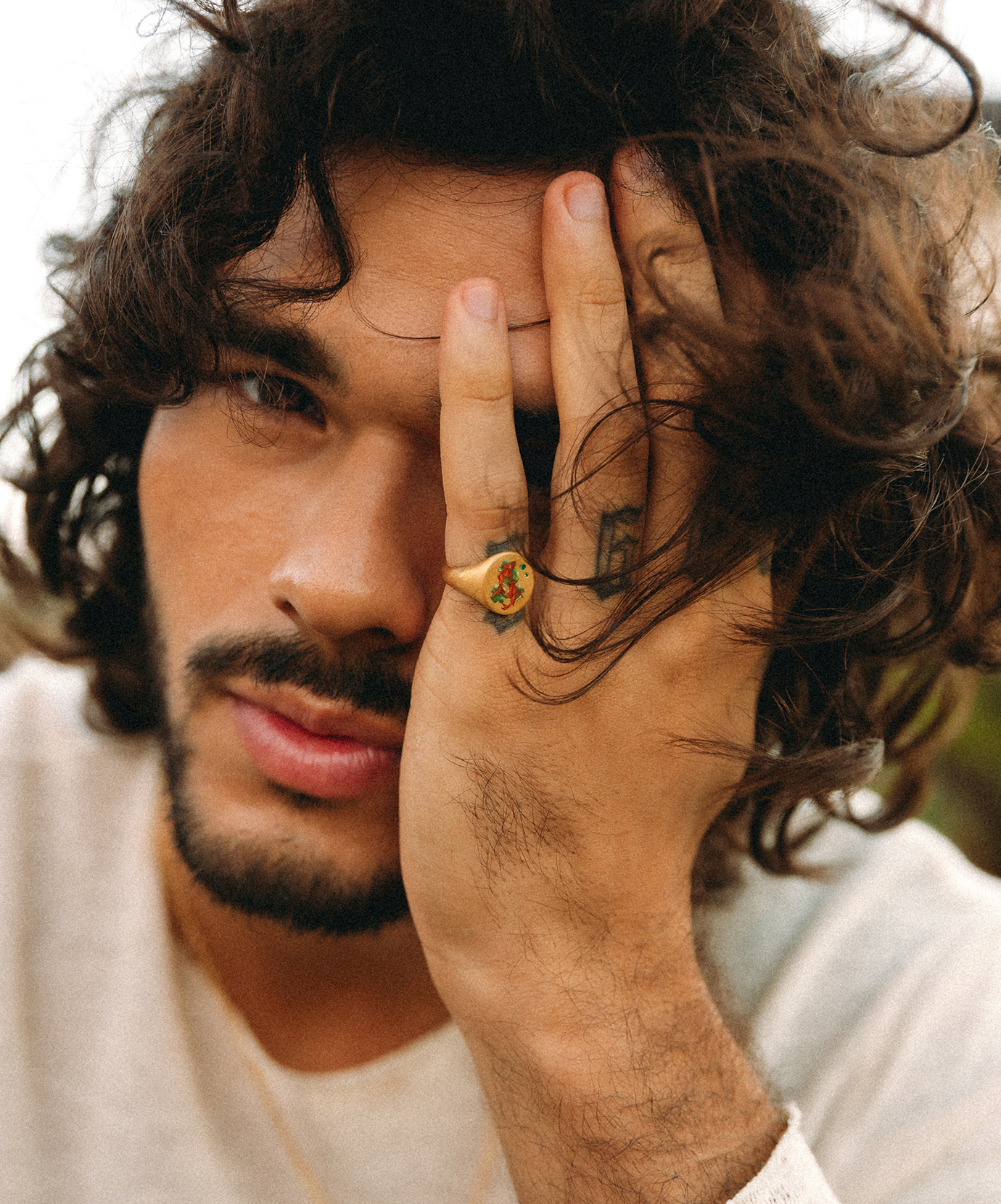 O anel também permite personalização com uma inicial ou número gravado nas laterais, criando uma peça absolutamente única e profundamente conectada à história de quem a escolhe.