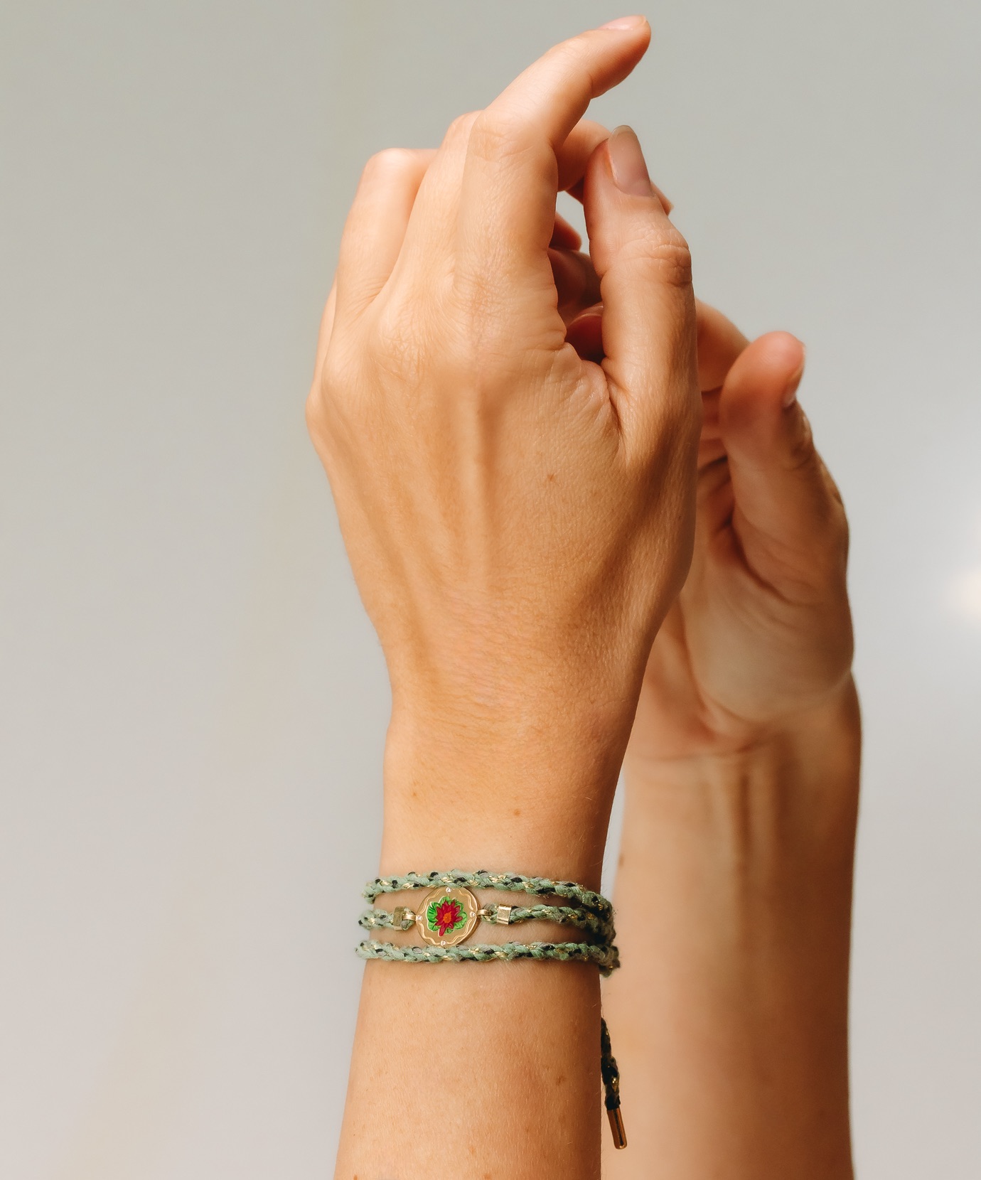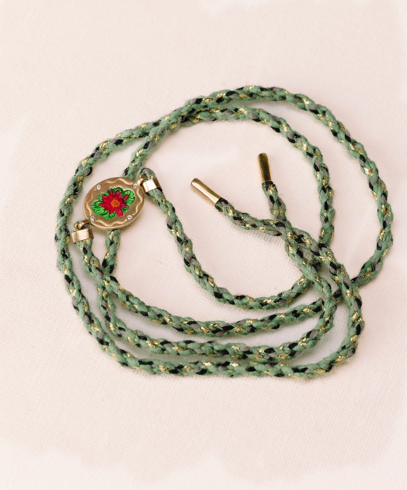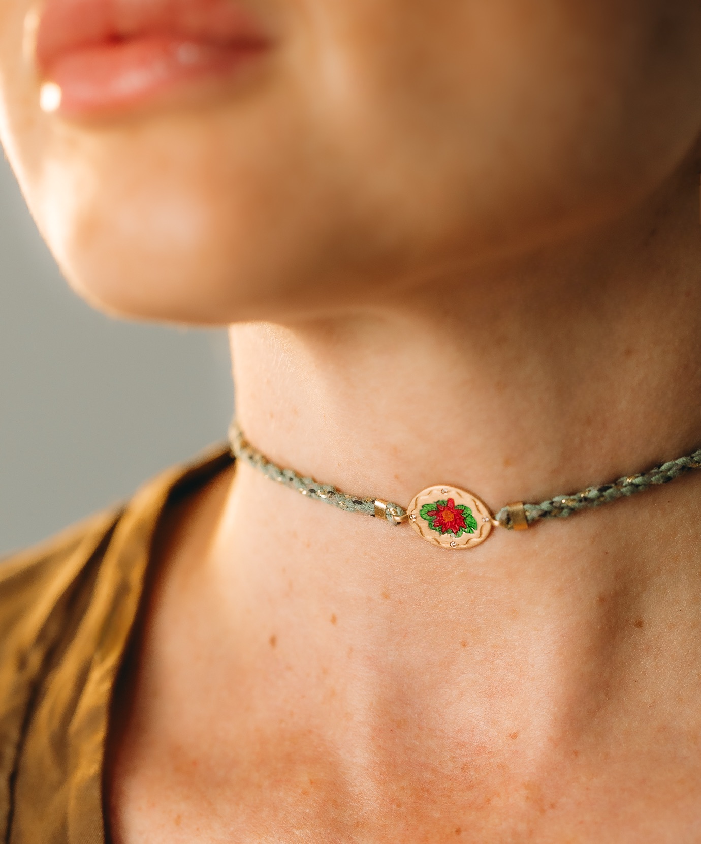 A Flor de Lótus foi concebida como uma joia versátil, que acompanha diferentes momentos da vida. Pode ser usada como pulseira, tornozeleira ou choker, adaptando-se ao corpo e à intenção de quem a veste. Essa multiplicidade de uso transforma a peça em um amuleto dinâmico, que se reinventa junto com sua história.