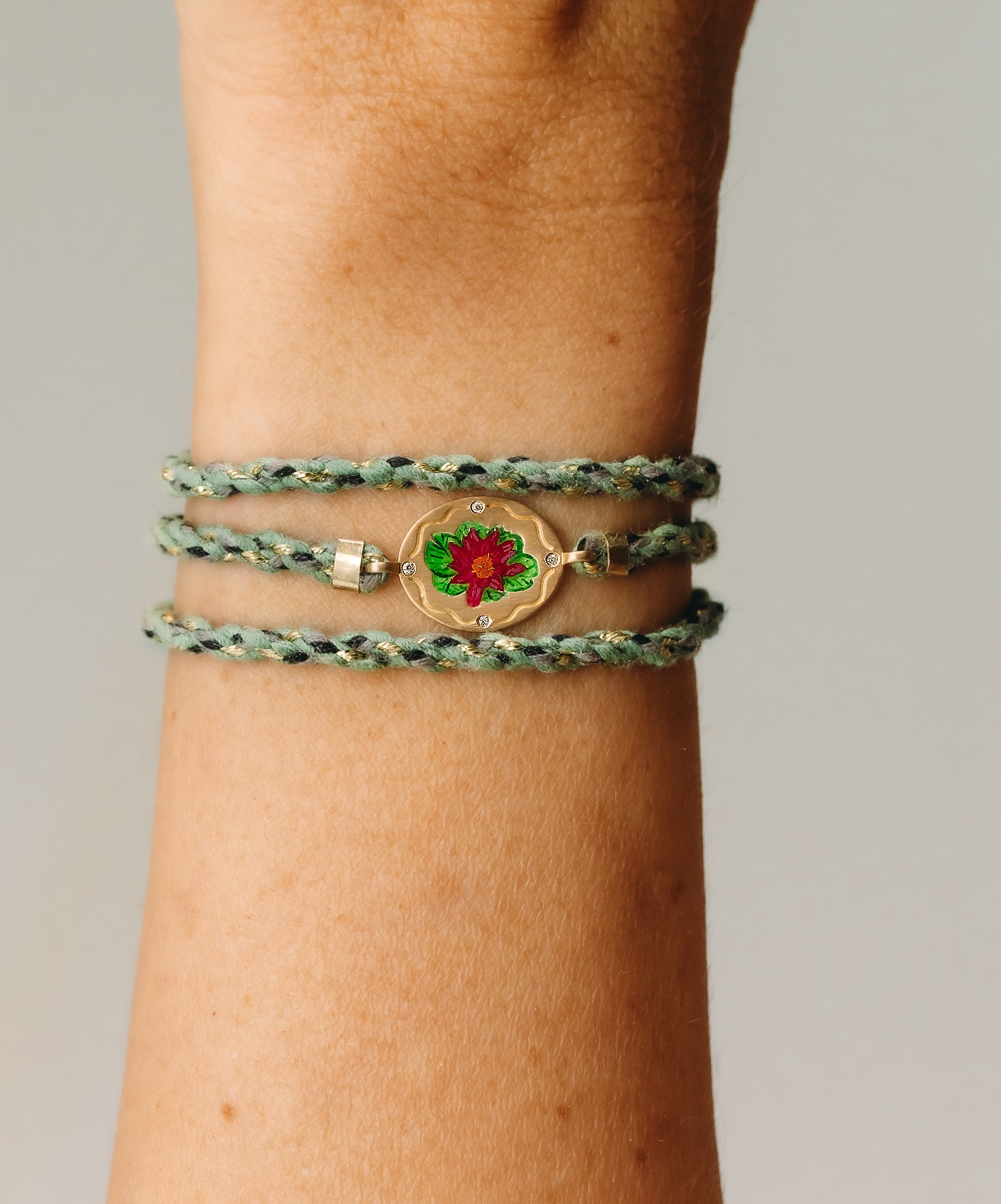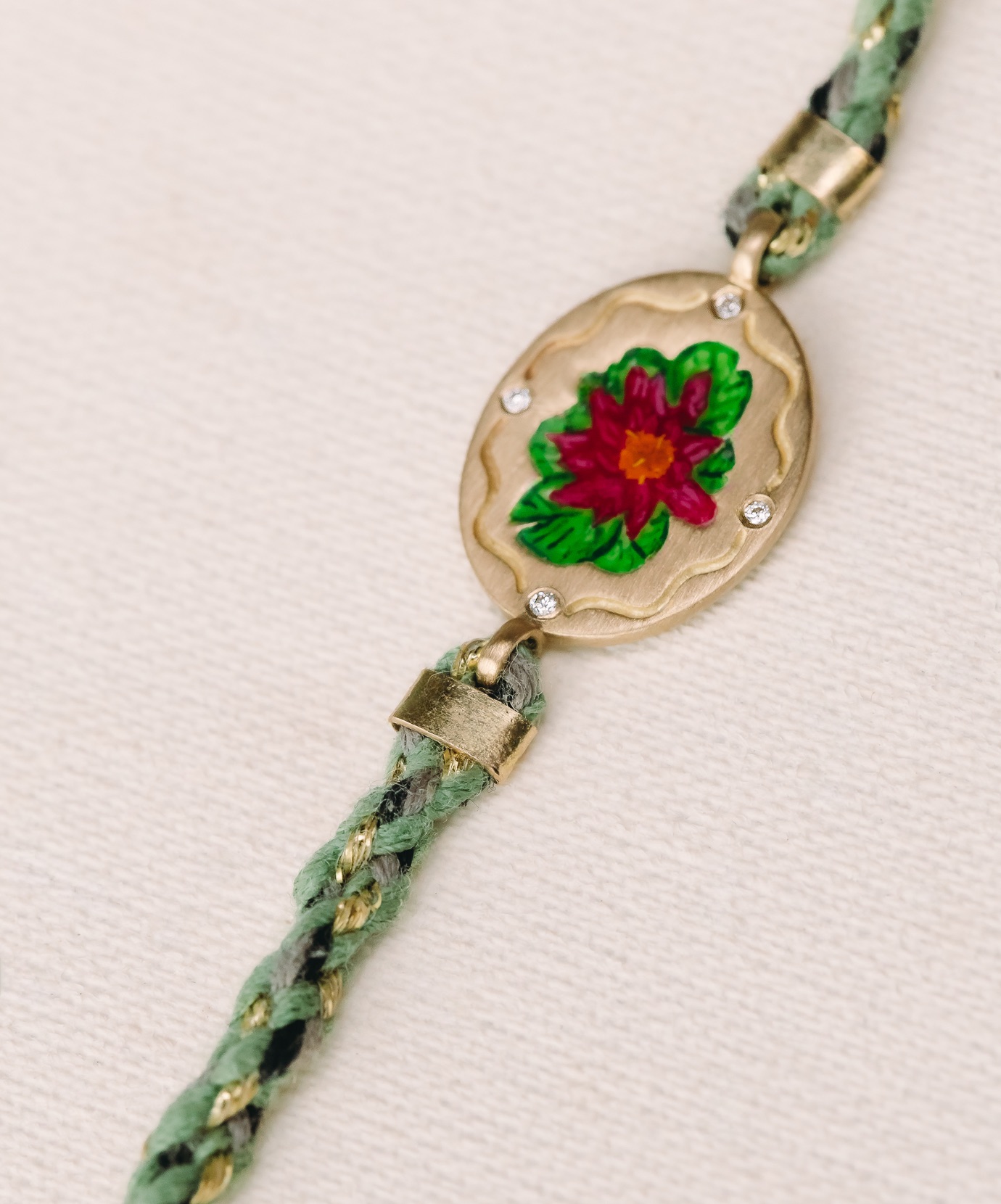 No centro da medalha, a flor ganha vida por meio da micro pintura esmaltada feita à mão, aplicada camada por camada com precisão artesanal. Cada nuance de cor revela profundidade e delicadeza, tornando cada peça única.
